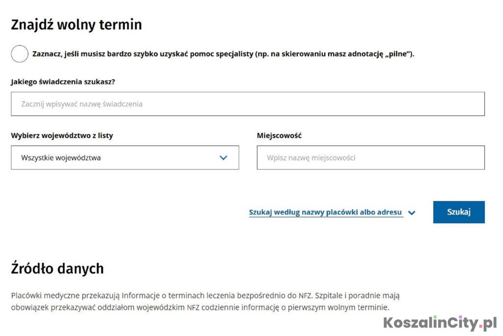 | Terminy Leczenia NFZ | terminyleczenia.nfz.gov.pl | Oficjalna wyszukiwarka Narodowego Funduszu Zdrowia umożliwiająca sprawdzenie aktualnych czasów oczekiwania na wizyty i zabiegi w ramach NFZ, również w Koszalinie. |