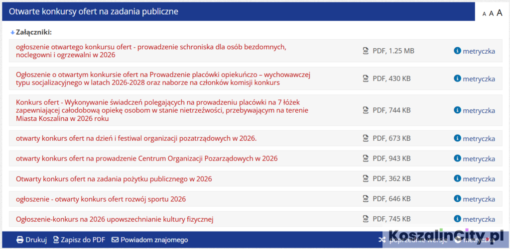 Szczegółowe ogłoszenia, regulaminy oraz załączniki dostępne są na stronie Biuletynu Informacji Publicznej Miasta Koszalina pod adresem: bip.koszalin.pl/artykul/1616/6736/otwarte-konkursy-ofert-na-zadania-publiczne
